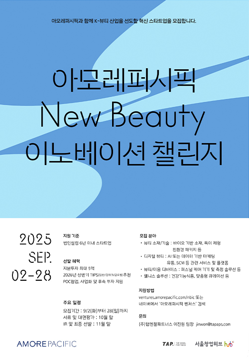 아모레퍼시픽이 뷰티 신기술 발굴을 위한 '뉴뷰티(New Beauty) 이노베이션 챌린지' 참가 스타트업을 공개 모집한다.